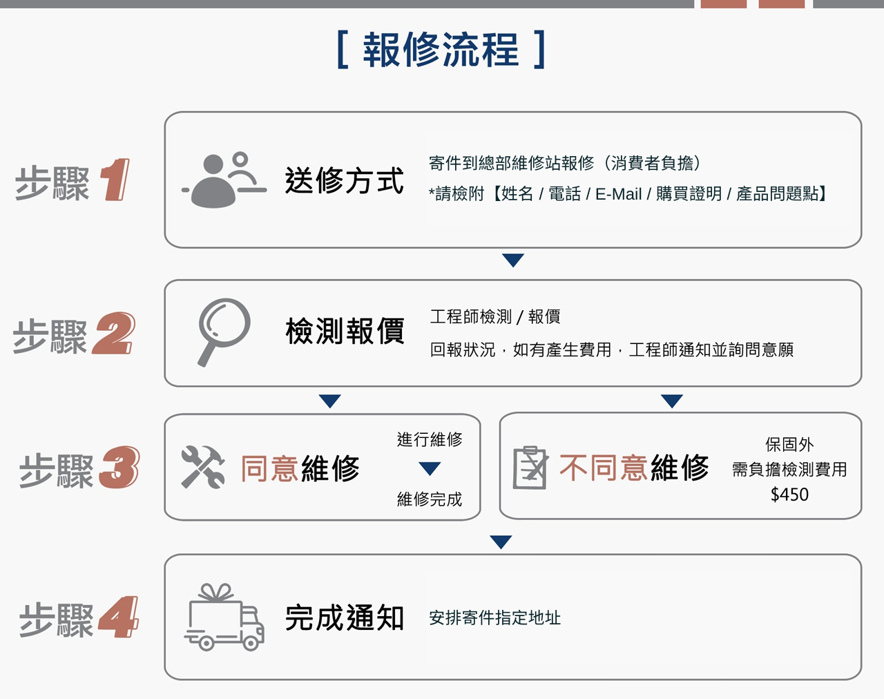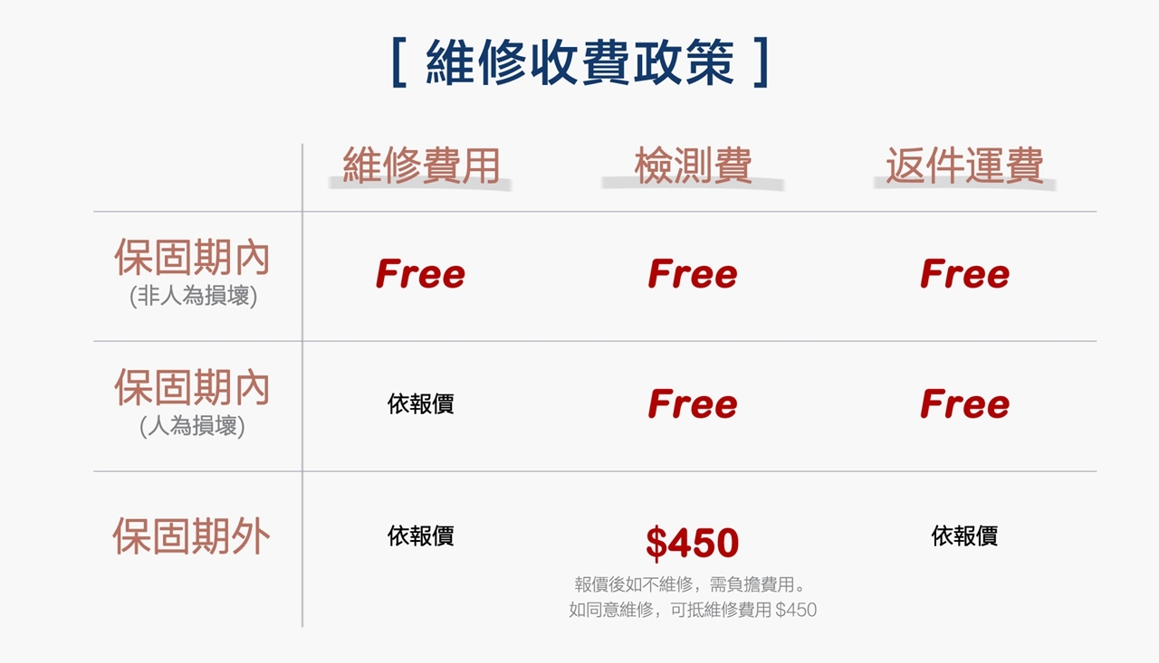 ✎ 如已超過保固期外,檢測後不同意維修,需負擔檢測費用 $450。