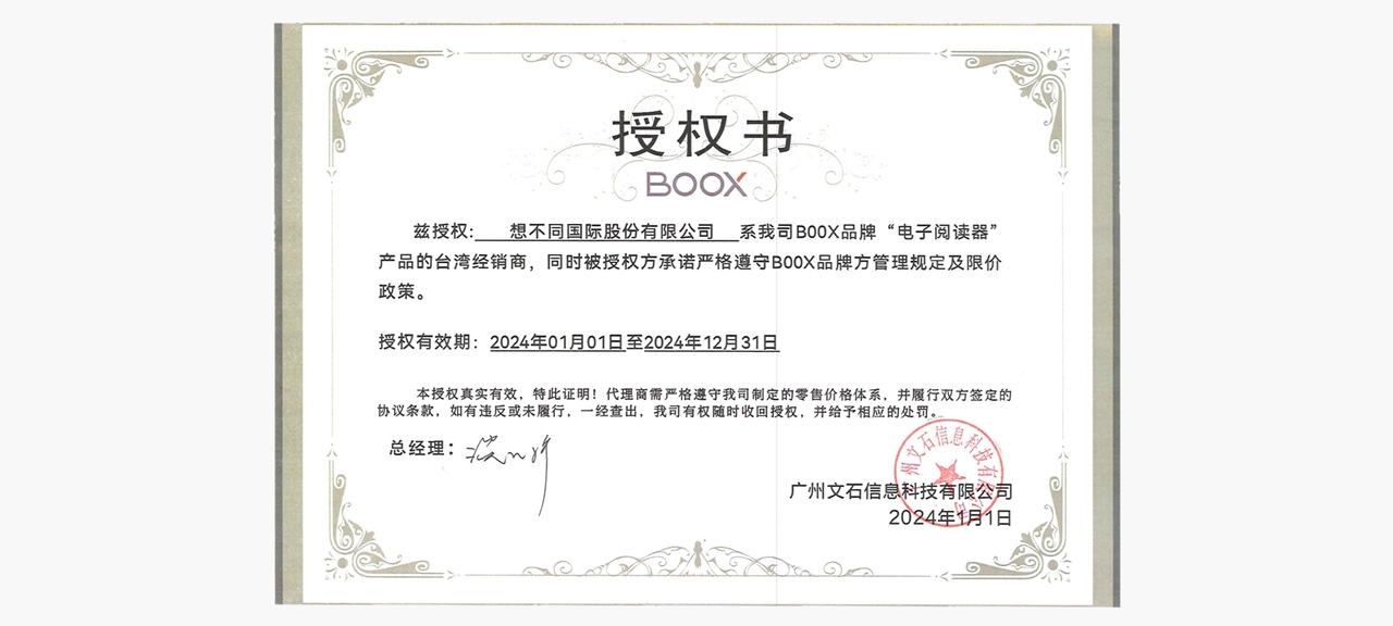 自 2019 年 8 月正式成為 Onyx BOOX 文石電子閱讀器在台灣的授權經銷代理,
