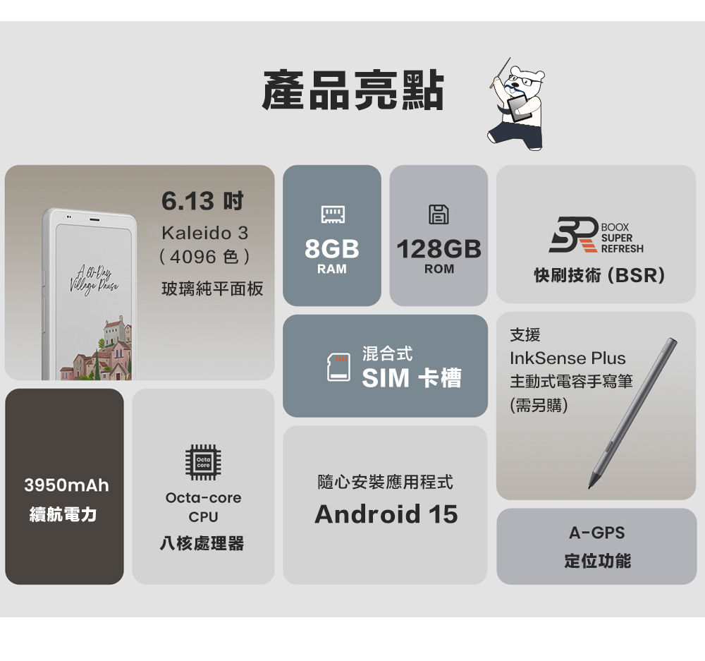 文石 BOOX Palma2 Pro 6.13 吋彩色電子閱讀器採用最新的 Kaleido 3 彩色電子紙技術,呈現 4096 色的細膩層次,彩色顯示達 412×824(150 PPI),黑白顯示則高達 824×1648(300 PPI),在陽光下依然清晰可讀。玻璃純平面板搭配可調節色溫的閱讀前燈,帶來真實紙感的閱讀體驗。搭載八核心處理器、8GB RAM 與 128GB ROM,支援 Android 15 系統,以 BOOX Super Refresh 快刷技術(BSR) 帶來順暢自然的操作手感。