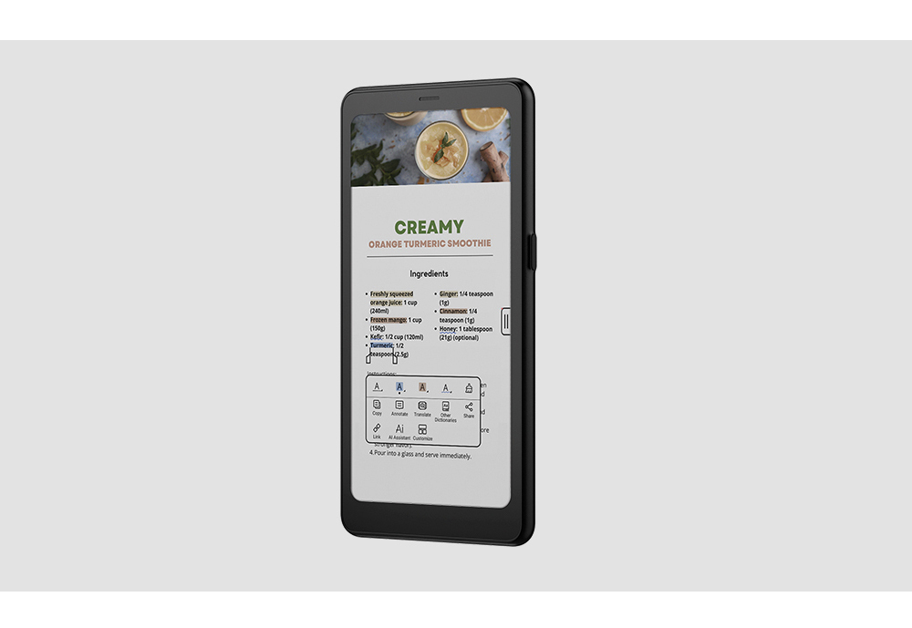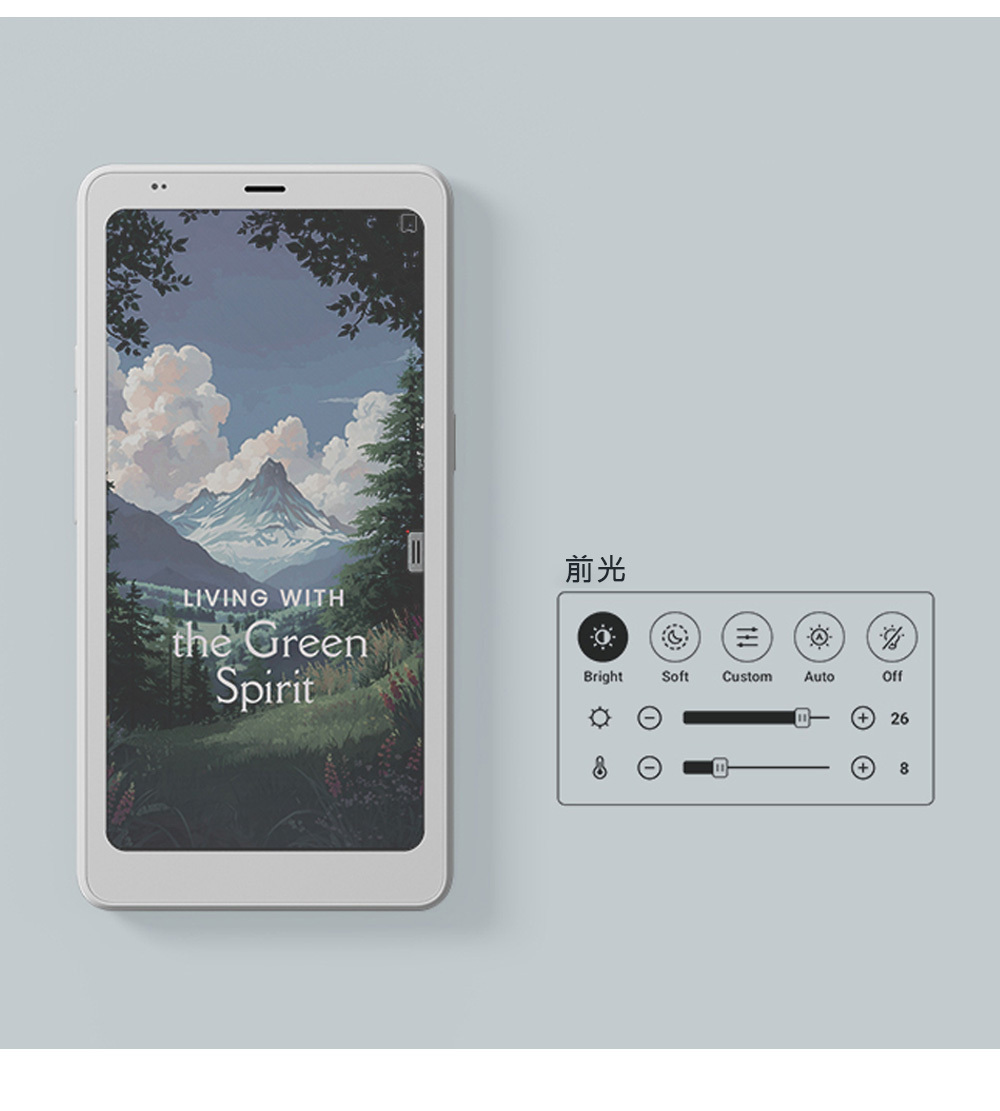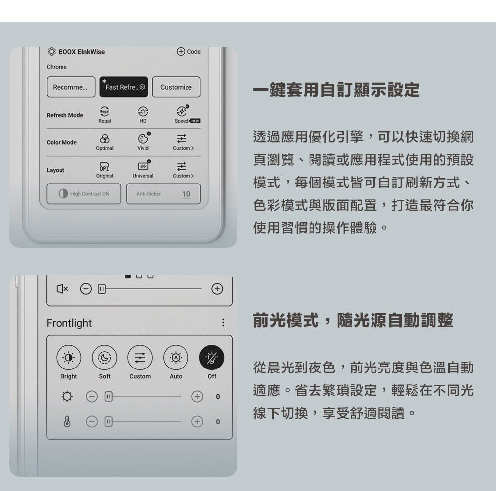搭載 Kaleido 3 彩色電子紙螢幕,在陽光下依然清晰可讀,有如報紙般的自然色調,讓每一頁文字與插圖都呈現最真實的層次。前光可依環境自動調整亮度與色溫,從白天到夜晚,都能沉浸於柔和的閱讀氛圍。