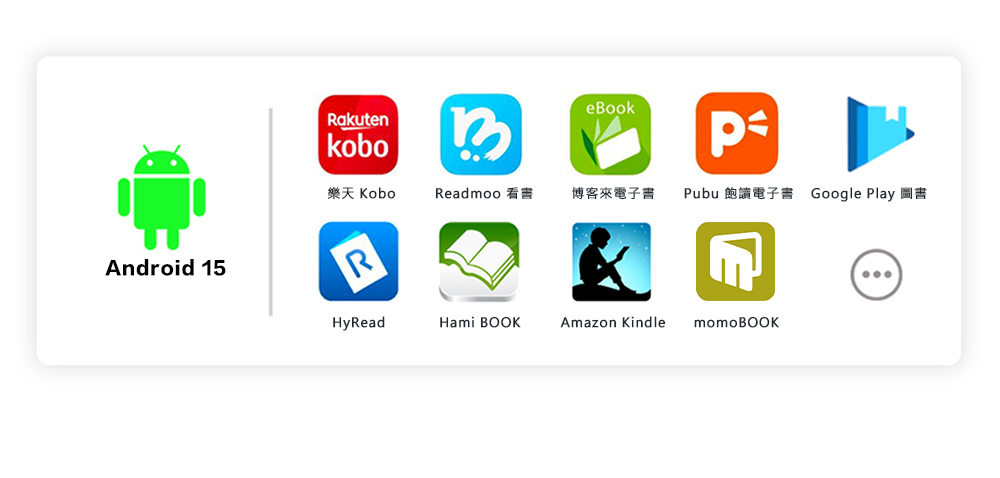 搭載 Android 15 開放式系統,Google Play 商店可安裝多種 Android 應用程式,你想要的筆記、閱讀、聽書,它完全發揮強大的任務處理功能。支援更多的 APP 應用,Kobo、HyRead、博客來、Readmoo、國家圖書館、Hami、Pubu、momobook … 等電子書城應用程式。