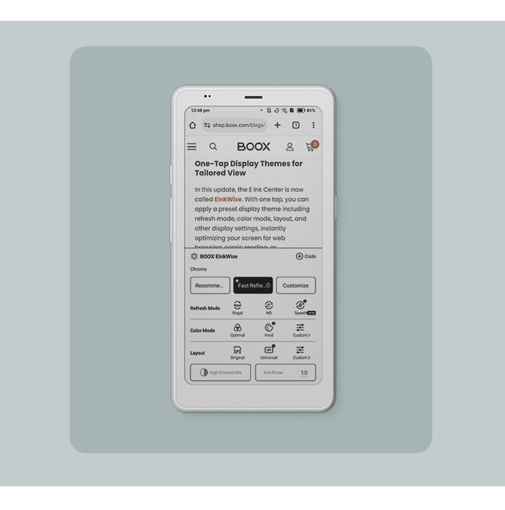 搭載八核心處理器、8GB 記憶體與 BOOX 超級刷新技術(BSR),操作滑順靈敏,頁面切換順暢自然。透過應用優化引擎,可一鍵切換閱讀、網頁或應用模式,並自由自訂刷新與色彩設定。