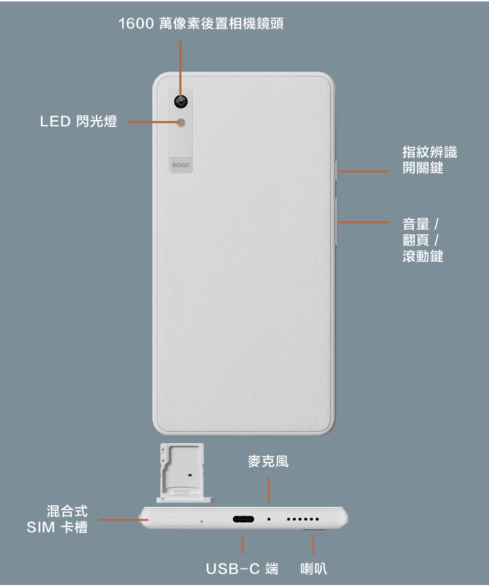 配備 1600 萬像素後置相機與閃光燈,能支援掃描文件或捕捉靈感。支援 A-GPS 精準定位、Wi-Fi 2.4G 5G 高速連線與混合式 SIM 卡槽,可擴充記憶或開啟行動數據,隨時保持連線。內建指紋辨識解鎖、麥克風與擴音裝置,USB-C 端口支援 OTG 擴充。