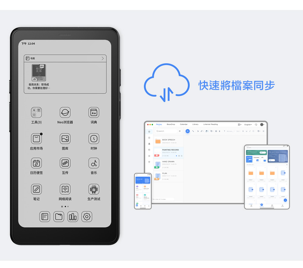 支援 Onyx Cloud、Google Drive、Dropbox 及 OneDrive,讓你的資料可在不同裝置間無縫存取。同時,內建 BOOXDrop 互傳功能,可在同一區域網路(LAN)內,與電腦或手機快速雙向傳檔,提升工作與學習效率。