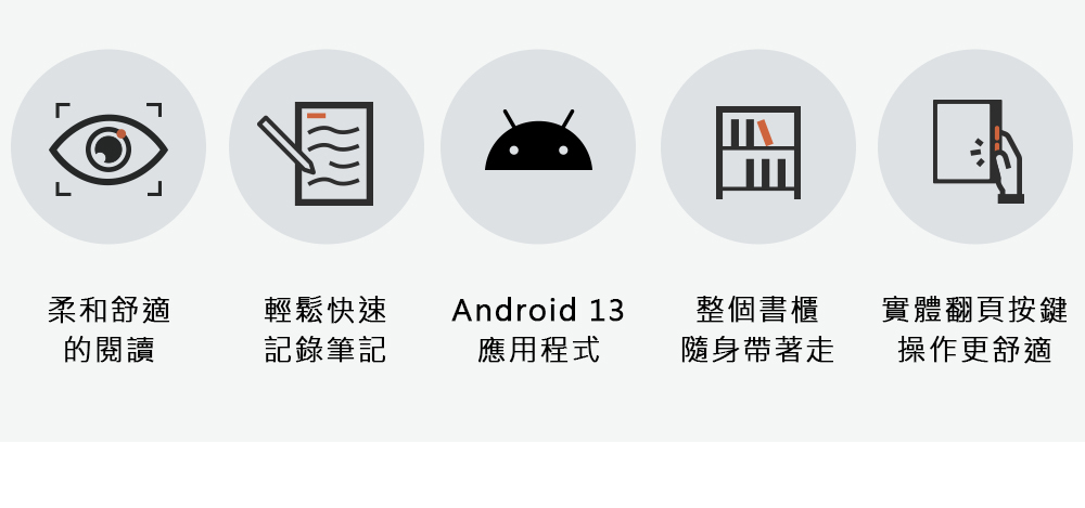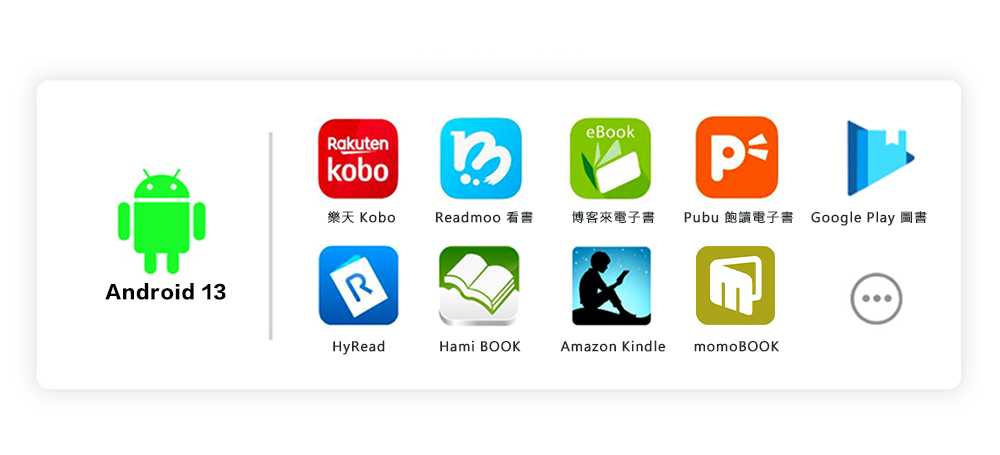 搭載 Android 13 開放式系統,Google Play 商店可安裝多種 Android 應用程式,你想要的筆記、閱讀、聽書,它完全發揮強大的任務處理功能。支援更多的 APP 應用,Kobo、HyRead、博客來、Readmoo、國家圖書館、Hami、Pubu、mybook …等電子書城應用程式。