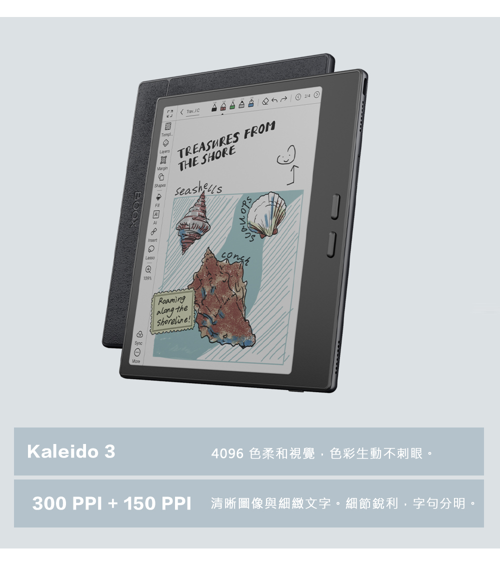 搭載 Carta 1200 技術,在彩色顯示技術、解析度、對比度與系統效能上都有顯著升級,為使用者帶來更細膩的視覺效果、更流暢的操作體驗,以及更廣泛的應用支援,是一款全方位優化的彩色電子紙閱讀器。提供如紙般細膩的閱讀體驗,並支援調節前光 (暖光、深色模式或關閉前光) 以適應不同環境的光線需求。