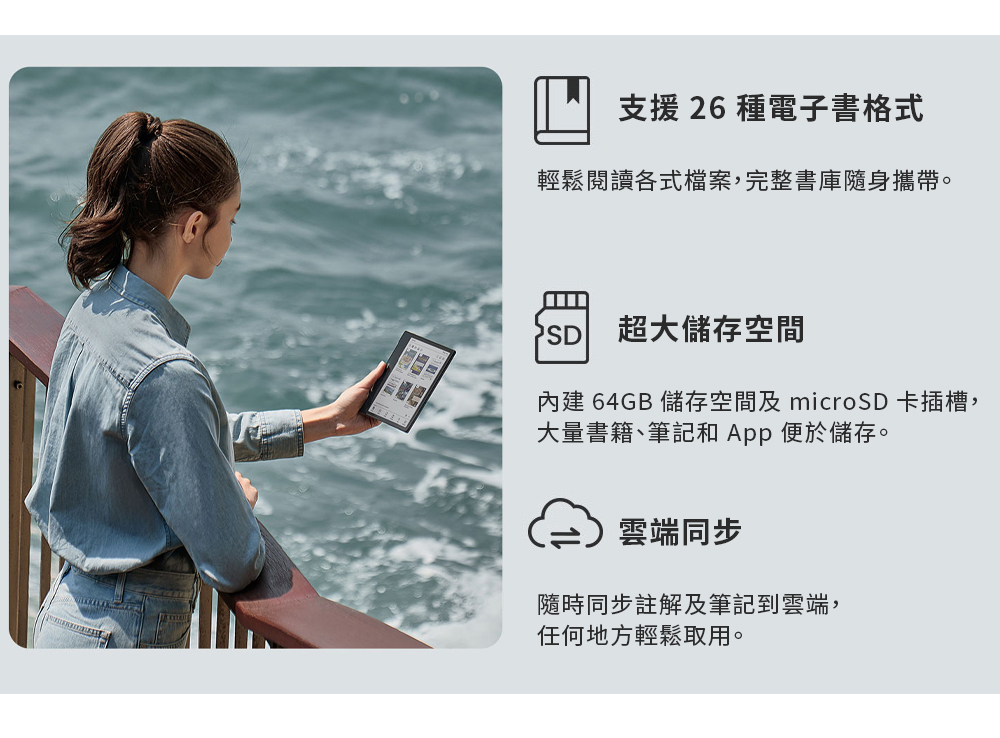 採用紙質般的觸感和穩固的握持設計,輕鬆享受閱讀時的舒適感受。