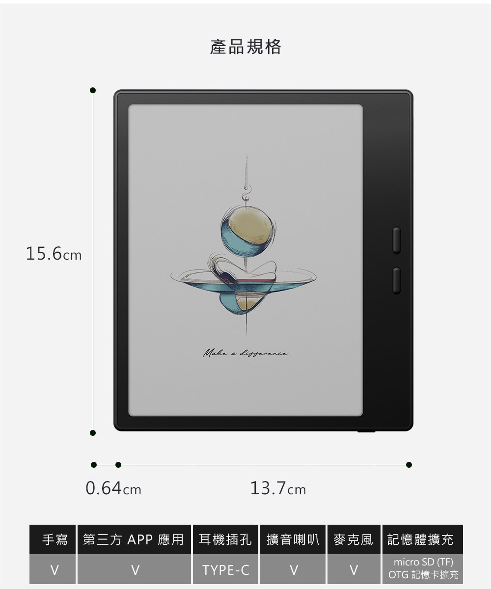 Wi-Fi 2.4G 5G 提供快速資料傳輸。內建麥克風與擴音裝置,支援文件 TTS 聲音閱讀功能,讓故事不僅可讀,也能用聽的。配備 2300mAh 大容量電池,提供持久續航,陪伴你的靈感之旅,無論在家、通勤還是戶外,都能隨時捕捉每個創意瞬間。