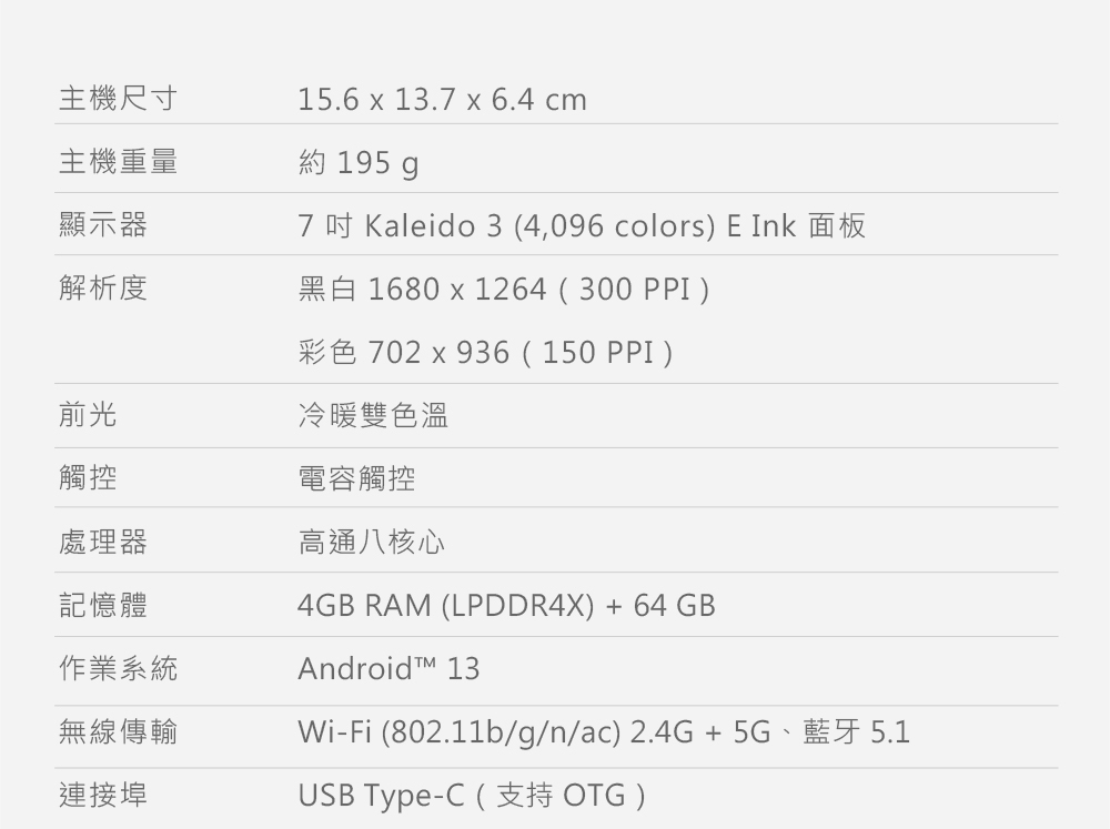7 吋 Kaleido 3 (4,096 colors) E Ink 面板