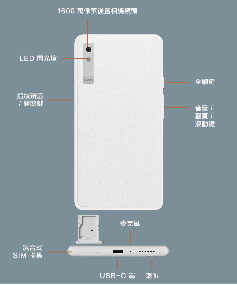 配備 1600 萬像素後置相機與閃光燈,能支援掃描文件或捕捉靈感。支援 A-GPS 精準定位、Wi-Fi 2.4G 5G 高速連線與混合式 SIM 卡槽,可擴充記憶或開啟行動數據,隨時保持連線。內建指紋辨識解鎖、麥克風與擴音裝置,USB-C 端口支援 OTG 擴充。