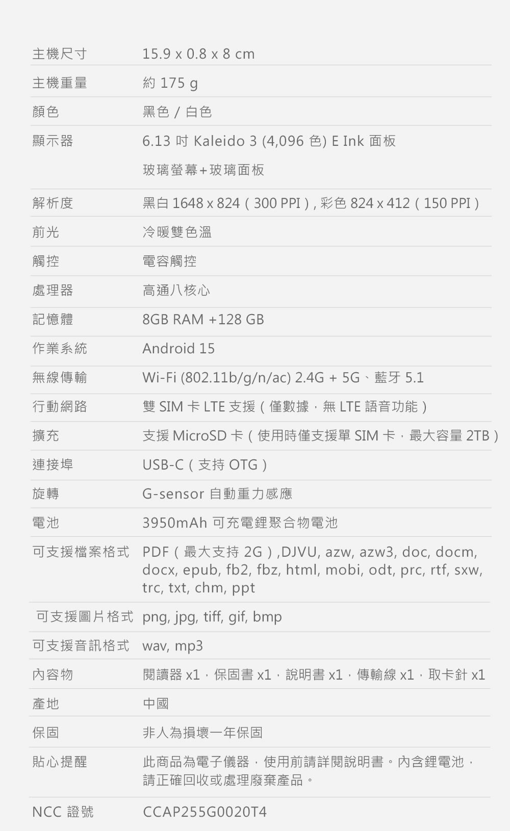搭載 Android 15 開放式系統,Google Play 商店可安裝多種 Android 應用程式,你想要的筆記、閱讀、聽書,它完全發揮強大的任務處理功能。支援更多的 APP 應用,Kobo、HyRead、博客來、Readmoo、國家圖書館、Hami、Pubu、momobook … 等電子書城應用程式。