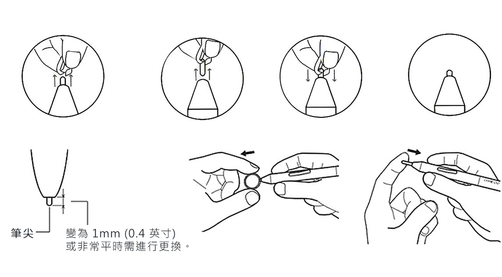 筆尖隨正常使用會磨損。壓力過大會使其磨損更快。當筆尖變得非常短或非常平的時候,請替換筆芯。