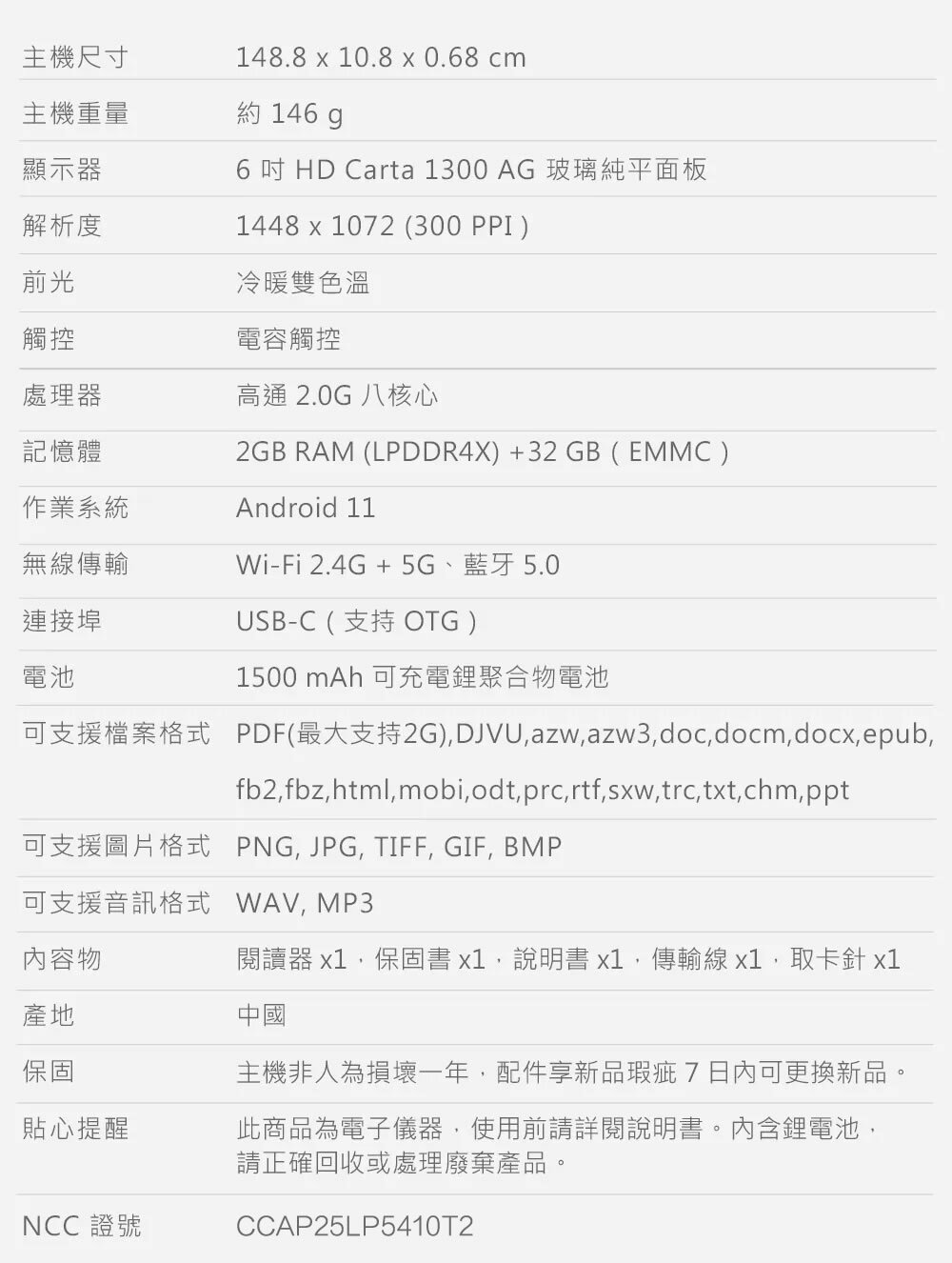 可調節色溫的閱讀前燈,無論白天或夜晚都能享受最佳的閱讀氛圍。支援 Wi-Fi 2.4G 5G 雙頻,實現無縫快速傳輸,讓知識在指尖自由流動。開放式 Android 11 系統,提供靈活的擴展功能,支援 micro SD (TF) 記憶卡擴充,滿足對資料存儲更多的需求。內建麥克風,讓語音功能應用更加便利,1500 mAh 電池帶來持久續航,陪伴每一次的深度閱讀。